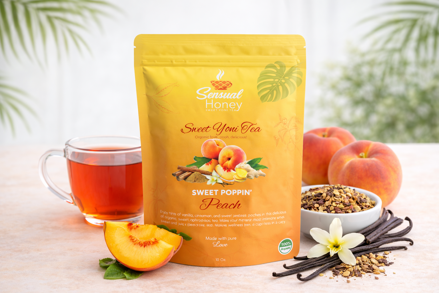 It’s an All Organic Herbal Tea Blend with Hints of Vanilla, Cinnamon, and Sweet Peaches. It helps to increase hormonal balance and Lubrication. It’s a Sweet, Aphrodisiac Tea with No Caffeine! Makes Your Intimate Area Juicy Like a Peach.